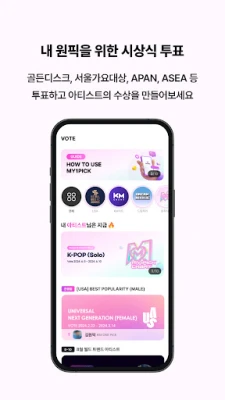 通过마이원픽,您可每日投出专属爱心,影响偶像实时排名。作为金唱片、首尔歌谣大赏等顶级颁奖礼的官方投票渠道,您的每一票都至关重要。平台亦汇集专辑、艺人MD、限量周边及K-美妆生活品,购物所得爱心还可用于投票,让支持偶像更简单。