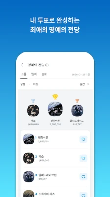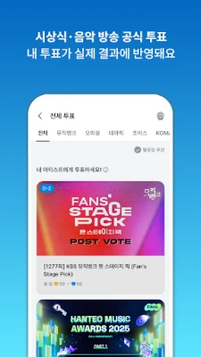 通过FANCAST,您的每一次点击都将转化为偶像迈向成功的强大助力。积极参与KBS Music Bank的官方预投票,您的选择将直接影响K-Chart的排名;在FAN'S STAGE PICK中,百分百由粉丝票选出的优胜者将赢得Music Bank的奖杯。此外,FANCAST还是KGMA (Korea Grand Music Awards)、Hanteo Music Awards 2025、Jupiter Music Awards等多个权威奖项的官方投票通道。您还可以投身Ilgan Sports × FANCAST独家主题票选及周榜月榜评选,实时追踪偶像的榜单表现,用热情铸就他们的辉煌。