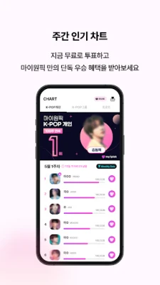通过마이원픽,您可每日投出专属爱心,影响偶像实时排名。作为金唱片、首尔歌谣大赏等顶级颁奖礼的官方投票渠道,您的每一票都至关重要。平台亦汇集专辑、艺人MD、限量周边及K-美妆生活品,购物所得爱心还可用于投票,让支持偶像更简单。